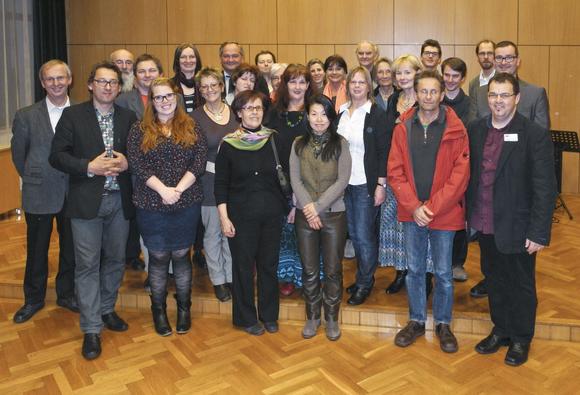 Eröffnungsredner P. Martin Rotheneder, die All our Beloved Saints Combo (Christian Amstetter, P. Jakob Deibl, Jakob Kammerer), die beitragenden Künstlerinnen und Künstler, Initiator und Kurator Franz Moser.